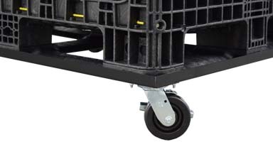 | Casters are bolted onto the frame to allow for easy replacement if needed. | The frame has a 1.25" lip that prevents containers from shifting during transport. The lower lip also allows forklifts to load and unload containers from the dolly. | Two swivel and two rigid casters allow for quick and easy controlled movement. |