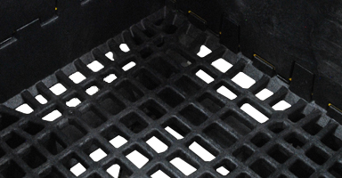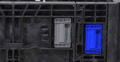 | Ergonomic spring loaded latches provide a quick and reliable locking mechanism for both access doors and collapsing sidewalls. | Interlocking sidewalls at the corner of the container ensure high load capacity and stability. | A solid floor bottom ensures small parts will not be lost and provides a smooth and even load surface. |